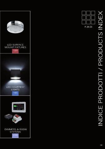 P. 20-23 LED RETRACTABLE LED SURFACE LAMPS MOUNT FIXTURES 114 120 LED READING LED COURTESY INDICE PRODOTTI / PRODUCTS INDEX LIGHTS LIGHTS 170 185 ELECTRONIC DIMMERS & RGBW ACCESSORIES SYSTEMS 228 236 19 Quick Marine Lighting - Edition 12 19